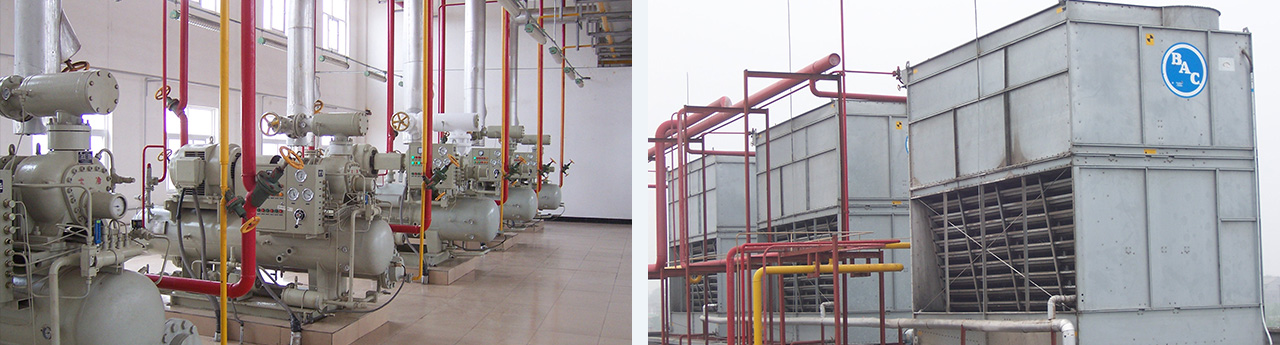 凍結(jié)間11間、共120噸。冷藏6間、共2000噸。冷卻平衡間5間、共110噸/小時。冷卻間2間,共22噸/20h。成品庫三間,共500噸/24h。空調(diào)系統(tǒng) 1000KW。年產(chǎn)16萬噸無公害豬肉,使用氨制冷系統(tǒng),末端冷風(fēng)機加排管。