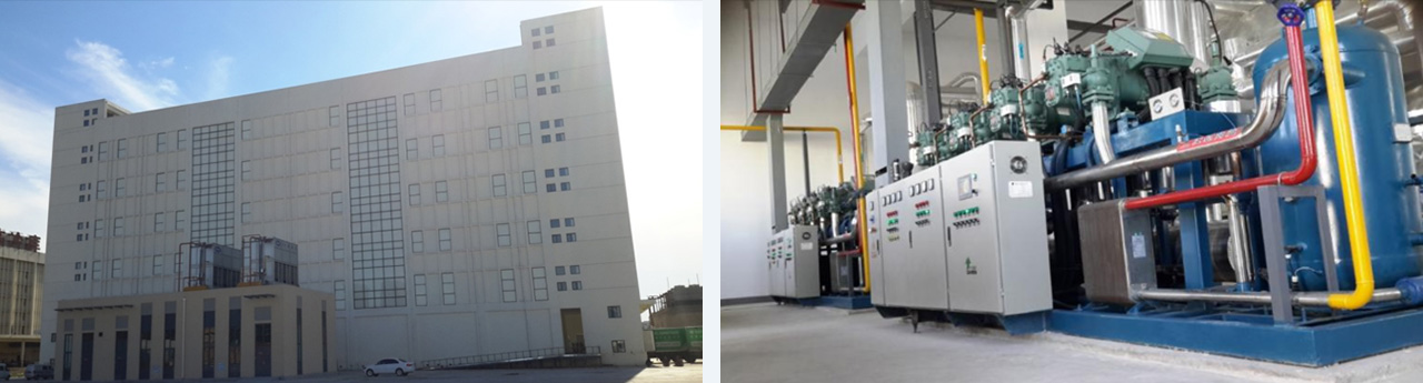 一座六層土建冷庫,總建筑面積25898㎡,總存儲噸位三萬噸,層高5.8米,共10間冷庫,采用氟利昂(R22)制冷系統(tǒng),末端鋁排管,手動熱氣融霜。