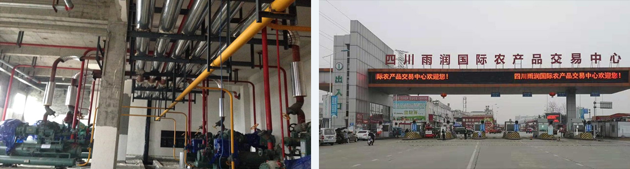 單座7層(地下一層、地上六層)土建高溫冷庫(kù),庫(kù)溫0-3℃。存儲(chǔ)量17400噸。層高4.8-6.6米,采用氨(R717)集中式制冷系統(tǒng),使用氨泵強(qiáng)制循環(huán)、下進(jìn)上出供液。末端冷風(fēng)機(jī),水溶霜及熱氨融霜。由雨潤(rùn)集團(tuán)、成都商物投集團(tuán)、成都農(nóng)發(fā)投公司共同投資興建的現(xiàn)代化綜合性農(nóng)副產(chǎn)品交易物流平臺(tái)配套冷庫(kù),是四川省現(xiàn)代農(nóng)業(yè)服務(wù)業(yè)重點(diǎn)項(xiàng)目之一,主要存儲(chǔ)果蔬。