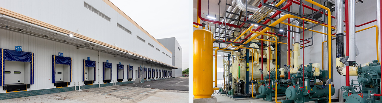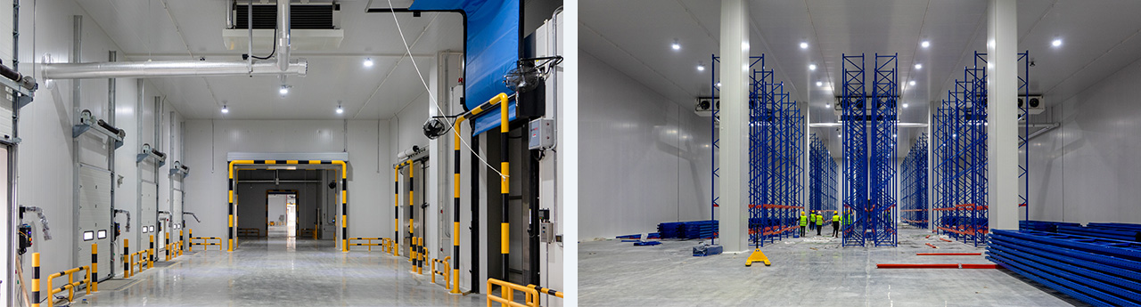 建筑面積108000m2。分為6間高低溫兩用庫(kù)(-20°C/-5°C)及南北兩個(gè)月臺(tái)。低溫存儲(chǔ)1萬(wàn)噸,高溫5500噸,。山綠集團(tuán)全自動(dòng)智能低溫5#車(chē)間設(shè)計(jì),采用氟(R507A)及二氧化碳(R744)載冷式制冷系統(tǒng)。末端設(shè)備采用吊頂式冷風(fēng)機(jī),水沖霜。